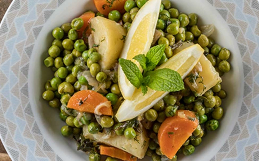 Ζεσταίνεις το ελαιόλαδο σε κατσαρόλα. Σοτάρεις το κρεμμύδι μέχρι να μαλακώσει. Προσθέτεις τα καρότα και τις πατάτες και ανακατεύεις για 1–2 λεπτά. Προσθέτεις τον αρακά και ανακατεύεις. Διαλύεις τη μουστάρδα στον χυμό λεμονιού. Προσθέτεις στην κατσαρόλα το μείγμα λεμόνι-μουστάρδα, τον ζωμό (ή νερό), αλάτι και πιπέρι. Σιγοβράζεις για 30–40 λεπτά μέχρι να μαλακώσουν τα λαχανικά και να «δέσει» η σάλτσα. Ρίχνεις τον άνηθο και (αν θέλεις) λίγο ξύσμα λεμονιού. Δοκιμάζεις και διορθώνεις λεμόνι/μουστάρδα ανάλογα με τα γούστα σου.