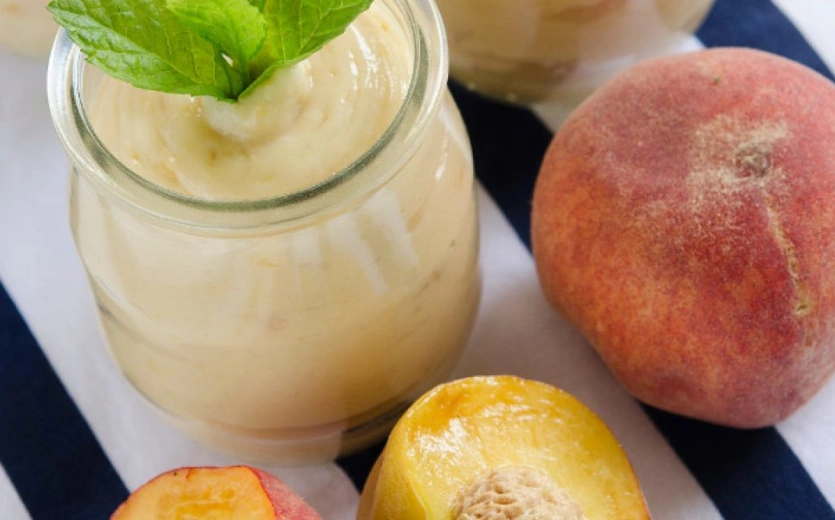 Σε μια κατσαρόλα βάζουμε το γάλα και τα πολτοποιημένα ροδάκινα και τοποθετούμε στη φωτιά. Σε ένα μπολ ανακατεύουμε τη ζάχαρη μαζί με το κορν φλάουρ και τα ασπράδια των αυγών. Όταν το γάλα αρχίσει να βράζει, αδειάζουμε το 1/3 μέσα στο μείγμα των ασπραδιών, ανακατεύουμε και αδειάζουμε το μείγμα στο βρασμένο γάλα ενώ είναι ακόμη στη φωτιά. Ανακατεύουμε γρήγορα έως ότου η κρέμα δέσει. Κατεβάζουμε από τη φωτιά, αδειάζουμε σε ένα μπολ και σκεπάζουμε με μεμβράνη, που να εφάπτεται πάνω στην κρέμα, ώστε να μη σχηματιστεί κρούστα. Αφήνουμε χλιαρύνει και τη βάζουμε στο ψυγείο για 1-2 ώρες. Όταν κρυώσει, τη χτυπάμε με σύρμα ή στο μίξερ έτσι ώστε να αποκτήσει λεία υφή. Μοιράζουμε σε 6 ατομικά μπολ.
