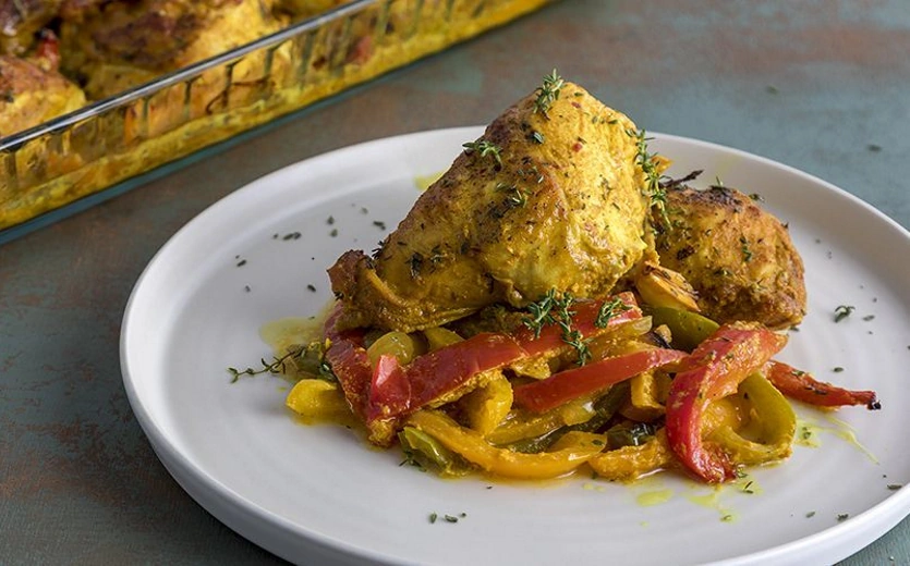 Προθερμαίνουμε τον φούρνο στους 180°C στον αέρα. Κόβουμε το κοτόπουλο σε 10 τεμάχια. Σε ένα μπολ βάζουμε τα κομμάτια κοτόπουλου, το γάλα καρύδας, το μπούκοβο, τον κουρκουμά, τις σκελίδες σκόρδο, το αλάτι, το πιπέρι, τον χυμό και το ξύσμα από τα λάιμ. Σκεπάζουμε και αφήνουμε στο ψυγείο να μαριναριστεί για 4-6 ώρες. Κόβουμε τις πιπεριές σε λωρίδες και τις απλώνουμε στον πάτο από ένα πυρίμαχο σκεύος. Βγάζουμε το μπολ από το ψυγείο και τοποθετούμε πάνω από τις πιπεριές τα κομμάτια κοτόπουλου και περιχύνουμε με το ζουμί από την μαρινάδα. Ψήνουμε στον φούρνο για 50-60 λεπτά. Σερβίρουμε με φρεσκοτριμμένο πιπέρι και φρέσκο θυμάρι, ψιλοκομμένο.