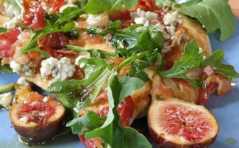 Ζητάμε από τον χασάπη να μας χτυπήσει τα φιλέτα για να μαλακώσουν. Σε αντικολλητικό τηγάνι ψήνουμε το κοτόπουλο. Σοτάρουμε κι από τις δύο μεριές μέχρι να ροδίσει, και συνεχίζουμε το μαγείρεμα προσθέτοντας λίγο σπιτικό ζωμό εάν έχουμε, ή αλλιώς λευκό κρασί κατά την διαδικασία μέχρι να ψηθεί καλά και στο εσωτερικό . Συνήθως δεν χρειάζονται παρά 7-10 λεπτά για να ολοκληρωθεί το ψήσιμο. Για την βινεγκρέτ τοποθετούμε όλα τα υλικά στο μούλτι και τα χτυπάμε μέχρι να ομογενοποιηθούν. Απλώνουμε σε μια πιατέλα το κοτόπουλο, από πάνω την ρόκα, τα σύκα και το ροκφόρ και περιχύνουμε με την βινεγκρέτ.