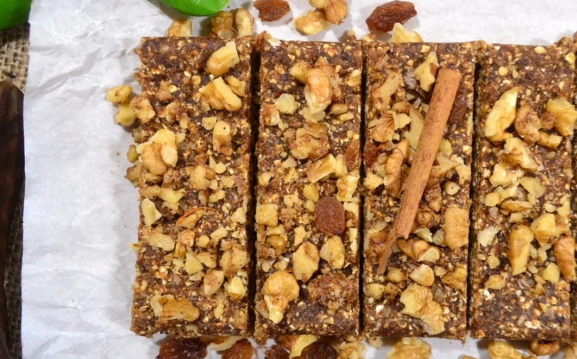 Σε ένα ταψί απλώνω τις νιφάδες βρώμης και τις ψήνω στους 180*C για 15 λεπτά, να καβουρδιστούν, μόλις σκουρύνει το χρώμα τους και μυρίσουν, τις βγάζω. Σε ένα μπολ αναμιγνύω πρώτα τα στερεά υλικά, τις καβουρδισμένες νιφάδες βρώμης, τις σταφίδες, τα καρύδια, τους κολοκυθόσπορους, την κανέλα και το μοσχοκάρυδο. Σε ένα πιάτο με το πιρούνι λιώνω την μπανάνα και την ενώνω με το μέλι. Τα προσθέτω στο μπολ με τα στερεά υλικά πολύ καλά όλα τα υλικά μαζί. Σε μια ορθογώνια φόρμα 14×10 εκ, καλυμμένη με λαδόκολλα ρίχνω και απλώνω το μείγμα. Με τη ράχη του κουταλιού πιέζω καλά την βάση να συμπιεστούν τα υλικά. Βάζω στο ψυγείο για τουλάχιστο 30 λεπτά. Κόβω σε κομμάτια και αποθηκεύω για 1 εβδομάδα στο ψυγείο σε αεροστεγές δοχείο.