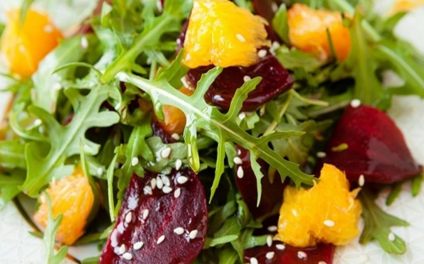 Κόβουμε τα παντζάρια σε ροδέλες την ψίχα από τα πορτοκάλια στα δύο και ανακατεύουμε με την ρόκα. Ρίχνουμε και την σως και ανακατεύουμε καλά.